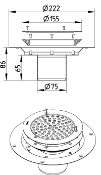 BLÜCHER Domestic-150 afløb for vinylgulve, med lodret Ø75mm udløb, lav model. Kan ikke monteres med indsatsvandlås |