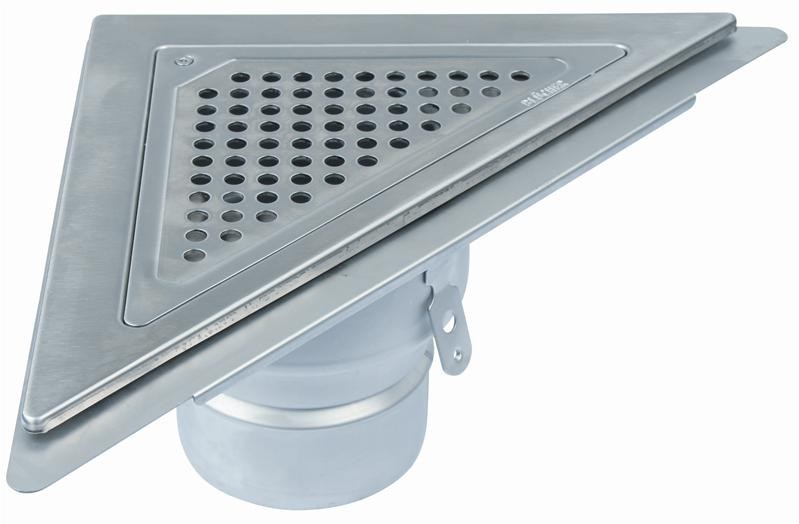 Blücher Trio type 350. Til hjørneinstallation mod 2 bagvæg i beton- og klinkegulve, med lodret Ø110mm udløb, med membranflange til vådrumssikring.