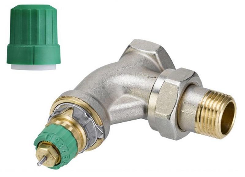 Vinkelløbende trykaflastet radiatorventil, type RA-DV. 3/8" gevind. RA-DV har indbygget trykregulator som holder et konstant differenstryk på 0,1 bar over ventilen, så det indstillede flow opretholdes.Ventilen har integreret flowbegrænser, og grøn dækhætte til foreløbig regulering. Anvendes til to-strengede anlæg. |