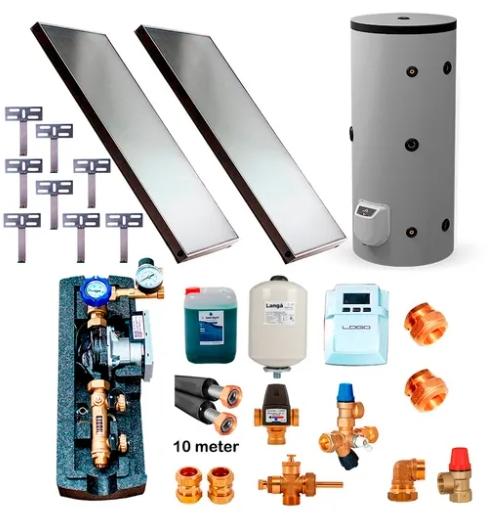 Pakke med alle nødvendige dele til et solvarmeanlæg. Skal blot samles og monteres. Denne pakke indeholder: