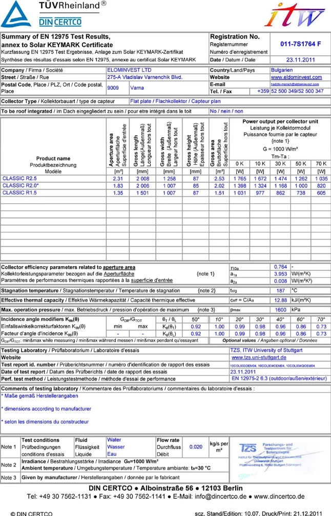 Effektivt solvarmepanel på 2 m2 Classic solvarmepaneler er robuste og miljøvenlige. De er en del af Eldominvest's Green Line, som fokuserer på grøn energi til gode priser, uden kompromis på kvalitet. Vores solpaneler udmærker sig ved deres høje virkningsgrad, solide konstruktion og fokus på billig og miljøvenlig vedvarende energi. Classic panelerne er godkendte af det tyske prøvningsinstitut Solar KEYMARK. De er en af de førende instituter inden for solvarme og deres certifikat garanterer at solvarmepanelet er af den højeste kvalitet. Vi anbefaler vores solfangervæske til alle vores solpaneler. Se også vores komplette solvarmeanlæg for at få en samlet løsning med alle nødvendige dele. Detaljer: