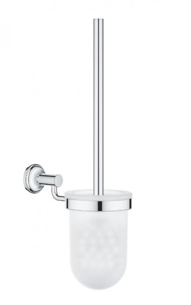 Grohe Essentials Authentic toiletbørste til væg - Krom Grohe Essentials Authentic er den perfekte serie af badeværelsestilbehør til dig med et traditionelt håndvaskarmatur eller vintage-stil på badeværelset. Designet er enkelt, men med fine detaljer såsom den fine vægroset og de smukke buer der pryder serien fra Grohe. Den uundværlige toiletbørste må gerne have et lækkert design, ud over sin praktiske funktionalitet. Denne væghængte toiletbørste har netop det: Den er helt enkel, og faktisk flot. Den matcher naturligvis med resten af badeværelsestilbehøret i Grohe Essentials Authentic. Find reservedele til Grohe Essentials Authentic toiletbørste nedenfor under relaterede varer. Specifikationer: