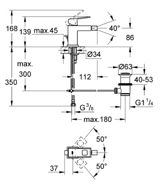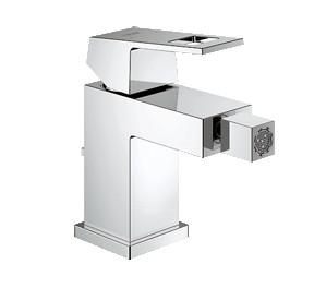Eurocube Etgrebsbatteri til bidet, DN 15 S-Size ethulsmontage metalgreb 28 mm keramisk patron GROHE StarLight® krom finish kugleledsmousseur løftestang med bundventil 1 1/4" fleksible tilslutningsslanger 3/8" GROHE QuickFix™ Plus installation system temperaturbegrænser