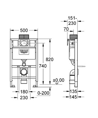 Grohe Rapid SL indbygningscisterne 82 cm - Top-/Frontbetjent En Grohe Rapid SL indbygningscisterne er det første skridt mod et væghængt toilet, som i dag bliver mere og mere populær. Det skyldes det pæne og enkle udseende samt den ekstra rengøringsvenlighed der følger med. Grohe Rapid indbygningscisterne er en af de bedste modeller på markedet og derfor en af vores mest solgte modeller. En Grohe Rapid indbygningscisterne gør det muligt, at placere toilettet på væggen i stedet for på gulvet. Det skjuler cisterne, vand- og afløbsrør i en såkaldt installationsvæg. Det er meget enkel, at bygge et træskelet omkring, eller bygge en hel væg op omkring. Den mest brugte løsning er, at bygge en lille væg op omkring cisternen og lukke toppen med en topplade der matcher møbelerme eller vinduesplade/karm på badeværelset. Denne plade skal blot fuges fast, på den måde kan man også komme til cisternens indmad hvis det skulle blive nødvendig. Husk at du udover cisternen også skal du bruge en betjeningsplade eller betjeningsknapper, og til sidst en hængeskål med sæde. Indbygningscisternen leveres med et selvbærende stålramme som er pulverlakeret, justerbare væg og gulvbeslag samt helstøbt isoleret cisterne, og er fabriksindstillet med et dobbelt skyl på 6 eller 9 liter. Indbygnigscisterne passer til alle hængeskåle med en boltafstand på 18 eller 23cm. Dette betyder at Rapid indbygningscisternen passer på stort set alle hængeskåle på markedet. Så er du fri for, at tænke andet end designet når du skal vælge din hængeskål. Vandet kan tilsluttes fra venstre, højre eller bagfra og der medfølger en tomrørsfiksering, som sikre mod utætheder. Indbygningscisternen leveres komplet med afløbsbøjning, fremføringshylster, ferulesæt og monteringsbolte. kort sagt alt hvad du skal bruge til cisternen. Det eneste du skal tilkøbe er en betjeningsplade. Alle de Grohe betjeningsplader – og knapper der passer til denne model finder du under relaterede varer. Her finder du også de mest populære hængeskåle. Mål: