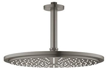 Grohe Rainshower Cosmopolitan 310 hovedbruser t/loft - Børstet hard graphite OBS: Varen er på lager - både til afhentning og dag-til-dag levering. Rainshower Cosmopolitan hovedbrusersættet er storebroderen til Rainshower Cosmopolitan 210 og giver endnu mere komfort via den bredere bruseflade på 310 mm. På denne måde kan du nyde strålemønsteret PureRain med de store og bløde dråber endnu mere intenst. Som sommerregn. Brusehovedet leveres med en brusearm til loftet. Brusehovedet er udstyret med GROHE DreamSpray, der sikrer et optimalt strålemønster, samt vores SpeedClean antikalksystem og DropStop, så du aldrig har problemer med, at der drypper vand fra brusehovedet ned på din ryg, når du lige har tørret den. Så hos GROHE bliver vi ved med at tænke på nye måder at forbedre vores produkter på, så du får endnu flere fornøjelser med vand.