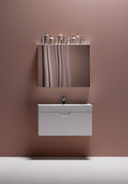 Håndvaskskab med soft close, samt håndvask og spejl.