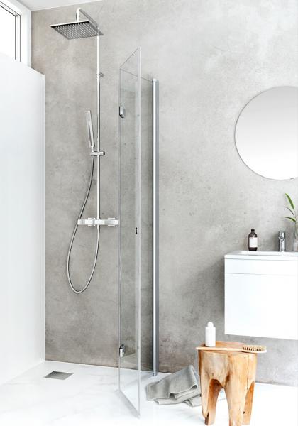 Hafa Igloo Pro foldedør - Klar glas - 70 cm Hurtigt monteret, svingbar, lige brusedør med integreret håndtag, der foldes på midten for at optage minimal plads. Limede profiler og nem at installere og justere takket være teknikken InstaQuick™. Kan monteres med udvendige 12-mm-rør, cc 35 mm. 6 mm hærdet sikkerhedsglas, højde 2000 mm. 18 mm glideskinne medfølger. Dørene er vendbare og egner sig til at bygge sammen med andre døre og vægge i IglooPro™-serien