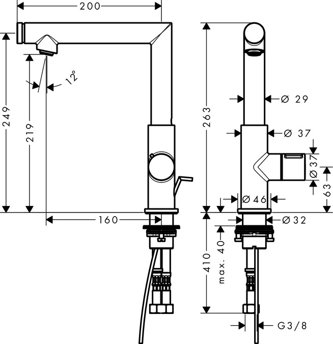 • vandet åbnes og lukkes på tuden, temperaturen reguleres med greb