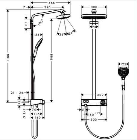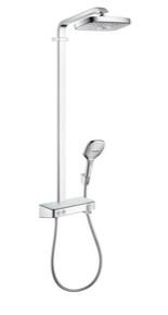 Hansgrohe Raindance Select E 300 2jet ST Showerpipe EcoSmart En luksuriøs kombination af hovedbruser, håndbruser og termostat i moderne SoftCube-design fra Hansgrohe. Hele kroppen indhylles i blød bruseregn eller forfriskende regnbrus i 30 cm bredde med Raindance Select E 300 hovedbruseren. Skift mellem de to stråletyper med et tryk på Select-knappen på bruserens stråleskive. Håndbruseren byder på hele tre stråletyper, som vælges med Select-trykknappen, der er placeret ergonomisk forrest på håndtaget. ShowerTablet Select 300 termostaten er i en klasse for sig: Tænd og sluk for bruserne med Select-knapperne til venstre, reguler temperaturen med den brugervenlige drejeknap til højre, og stil dine shampooflasker på den smukke hylde af sikkerhedsglas. Showerpipen kan let installeres på en eksisterende vægtilslutning.