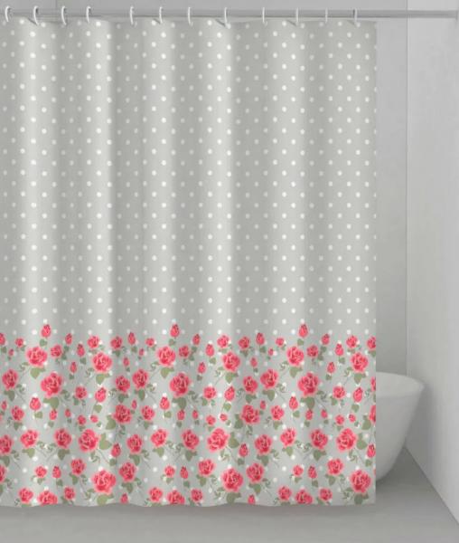 Hefe Lady Marie badeforhæng Badeforhænget til det romantiske eller feminine badeværelse. Mønstret er lysegråt med hvide prikker og de fineste røde roser i bunden. Slå to fluer med et smæk, og få en bruseafskærmning som samtidig skaber atmosfære og personlighed i badeværelsets indretning. Det vandafvisende badeforhæng leveres med hvid forhængsringe og har en polypropylentråd indsyet i bunden, for at give den nederste kant lidt tyngde. Specifikationer:
