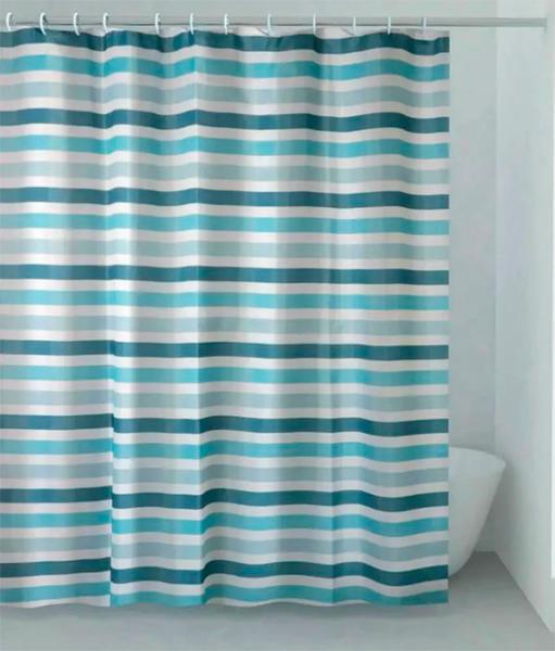 Hefe Stripes badeforhæng m/blå striber 120 x 200 cm Slidstærkt badeforhæng fra Hefe i smukke blå og hvide, vandrette striber. Den vandafvisende overflade stopper vandsprøjt fra badet til at nå ud i resten af rummet. Specifikationer:
