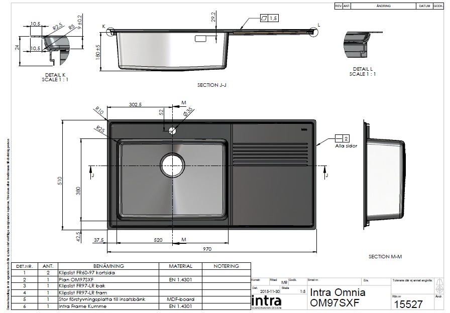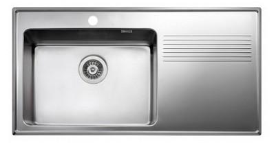 Køkkenvask for nedfældning, under- eller planlimning med stor vask og afløbsbakke. De stramme linjer og afrundede hjørner giver et moderne, men harmonisk udtryk. Leveres med manuel strainer, overløb og vandlås.