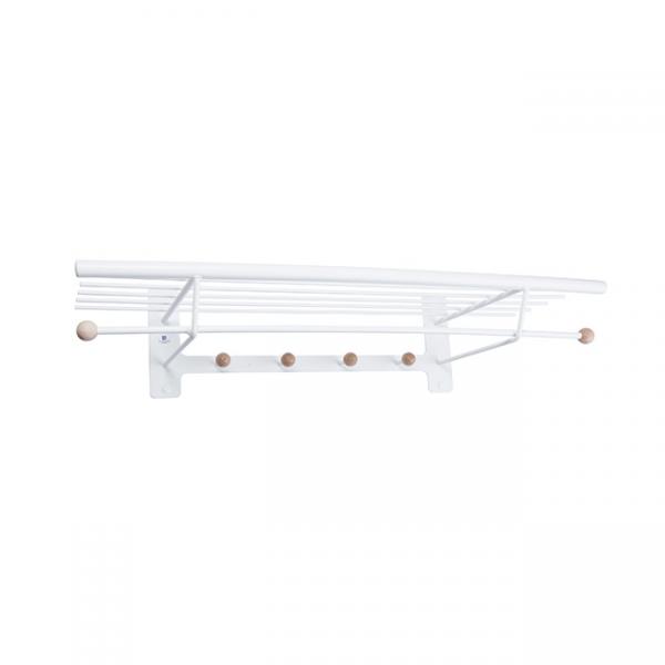 Lastein Sir James 7-65 hattehylde m/knagerække og bøjlestang - Hvid/eg Lastein Sir James hattehylde er et 3-i-1 møbel, som med sine flere funktioner lader dig få orden på entréen. Hattehylden har, udover sin hylde-funktion, nedenunder en knagerække med runde trækugler for enden af hver knage, og en bøjlestang, ligeledes med trækugler for hver ende. Trækuglerne virker som en visuel prik over i'et, men forhindrer samtidig at beklædningsdele eller bøjler falder af. Her er altså plads til alt fra halstørklæder, jakker, frakker og tasker. Denne Lastein Sir James hattehylde passer naturligvis med resten af Lasteins sortiment i farver og design, så du kan indrette entréen med en rød tråd. Specifikationer: