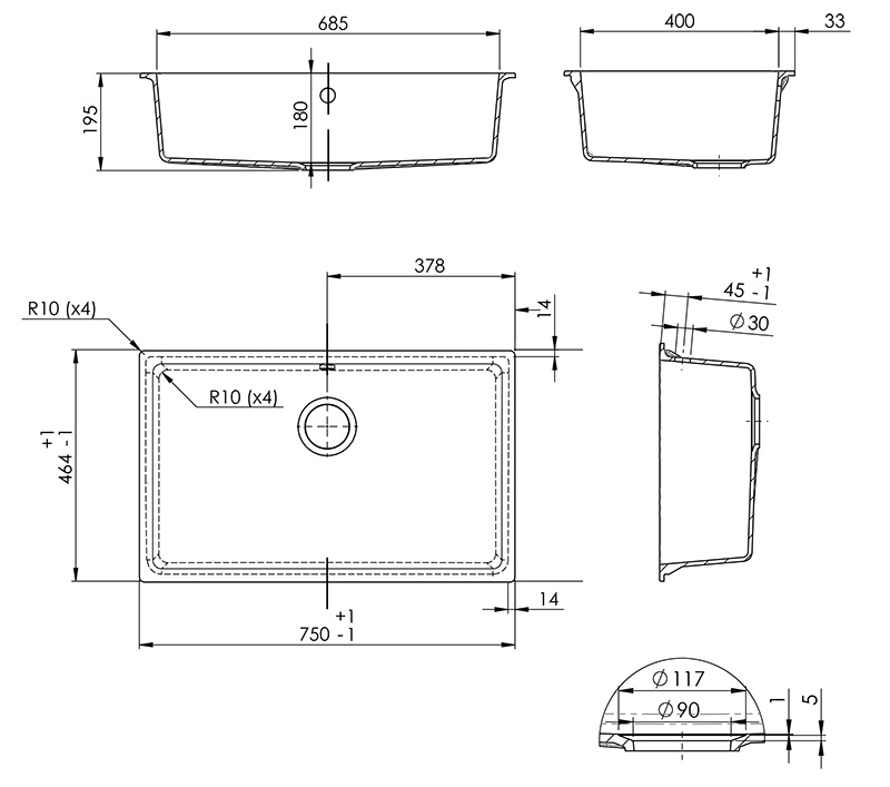 Designet er praktisk og uden hanehul. Kompositmaterialet er af høj kvalitet - det er en kombination af granitgranulat og bindemiddel - som gør vasken meget slidstærk, syrefast, ridsefast og rengøringsvenlig. Denne køkkenvask opfylder altså ethvert ønske om en praktisk køkkenvask med et æstetisk udseende. Specifikationer: