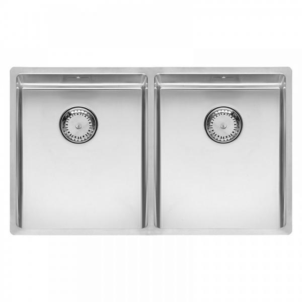 Rustfri stålvask, uden hanehul, med to kummer i moderne firkantet design med comfort afløb.