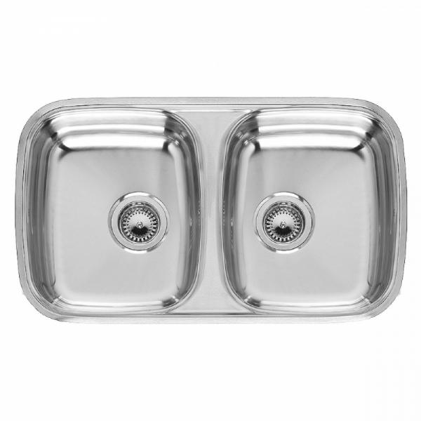 Rustfri dobbelt stålvask. De indvendige runde hjørner giver et harmonisk design, ligeledes er de indvendige runde hjørner rengøringsvenlige.