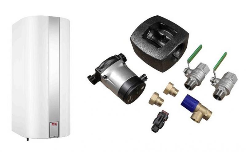 Systemsæt til varmepumpe bestående af sikkerhedsventil, cirkulationspumpe, kuglehaner og en bufferbeholder model 110 S (uemaljeret - kun til dødt vand).
