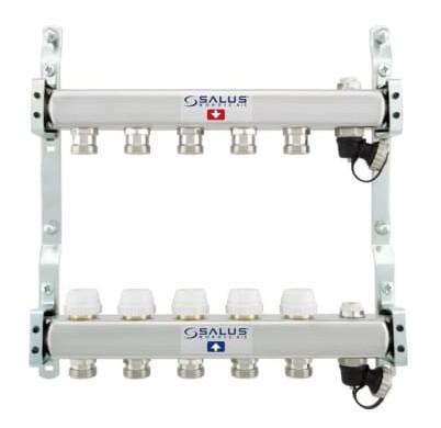 Gulvvarmemanifold, i rustfrit stål samlet med 2 kraftige vægbeslag. 1" tilslutning for varme frem og retur samt 1/2" x 3/4" nippel tilslutning til pex. Udluftnings skrue og aftapningsventil på både frem og retur. 20mm omløber medfølger. |
