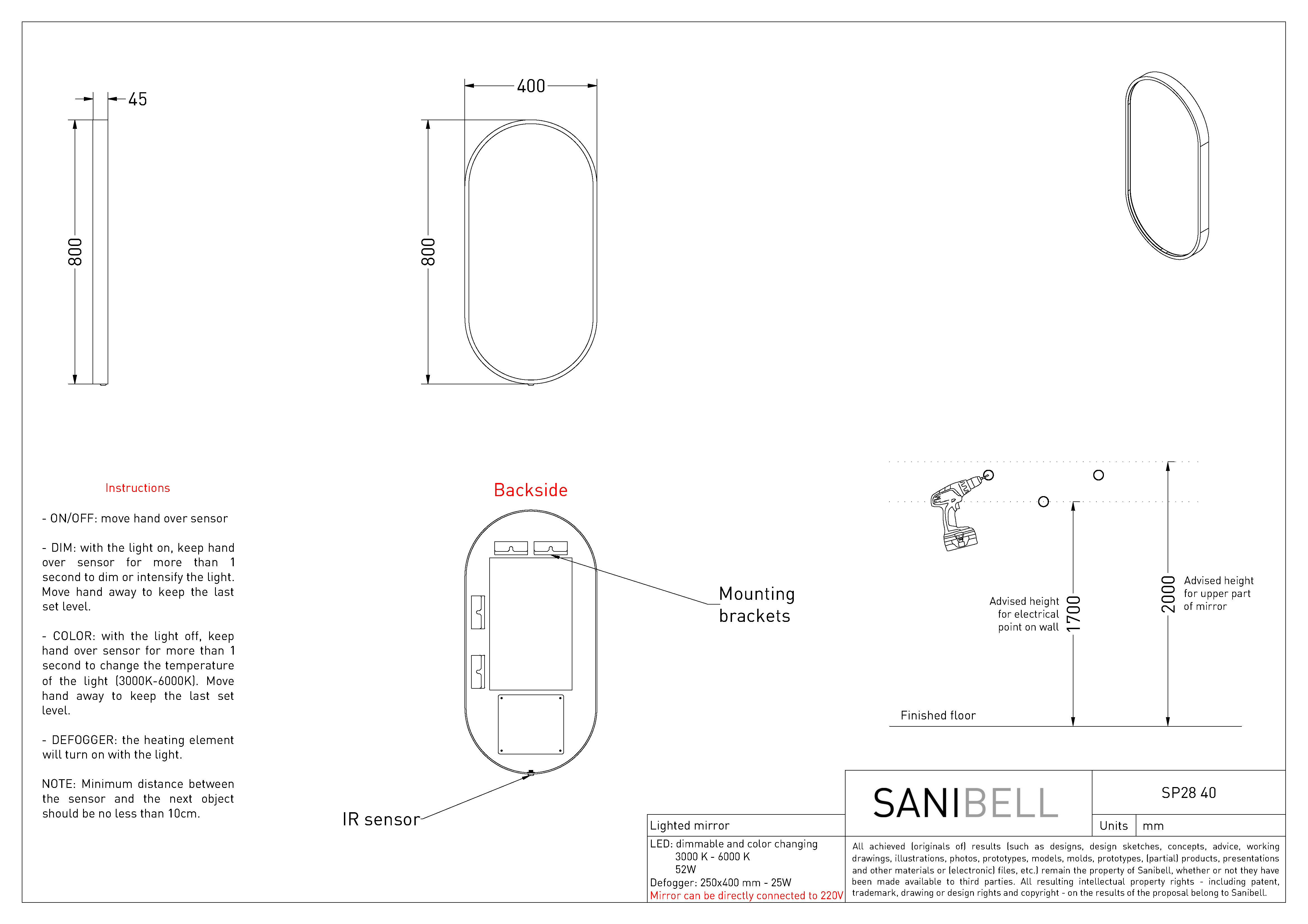 Sanibell Ink SP28 ovalt spejl m/lys, varme og sensor 40 x 80 cm - Børstet mat guld Charmerende ovalt spejl fra Sanibell Ink. Dette badeværelsesspejl har LED-lys indbygget i rammen, så du opnår et godt, jævnt lys. Selve lysets farvetemperatur kan ændres, så det passer placering, klokkeslet eller behov. Spejlet har desuden indbygget varme, hvilket betyder, at du kan nyde et dugfrit spejl, selvom du har nydt et langt og varmt bad. Dette spejl fås i 6 flotte farvevarianter, så det kan matches perfekt med resten af badeværelset. Specifikationer: