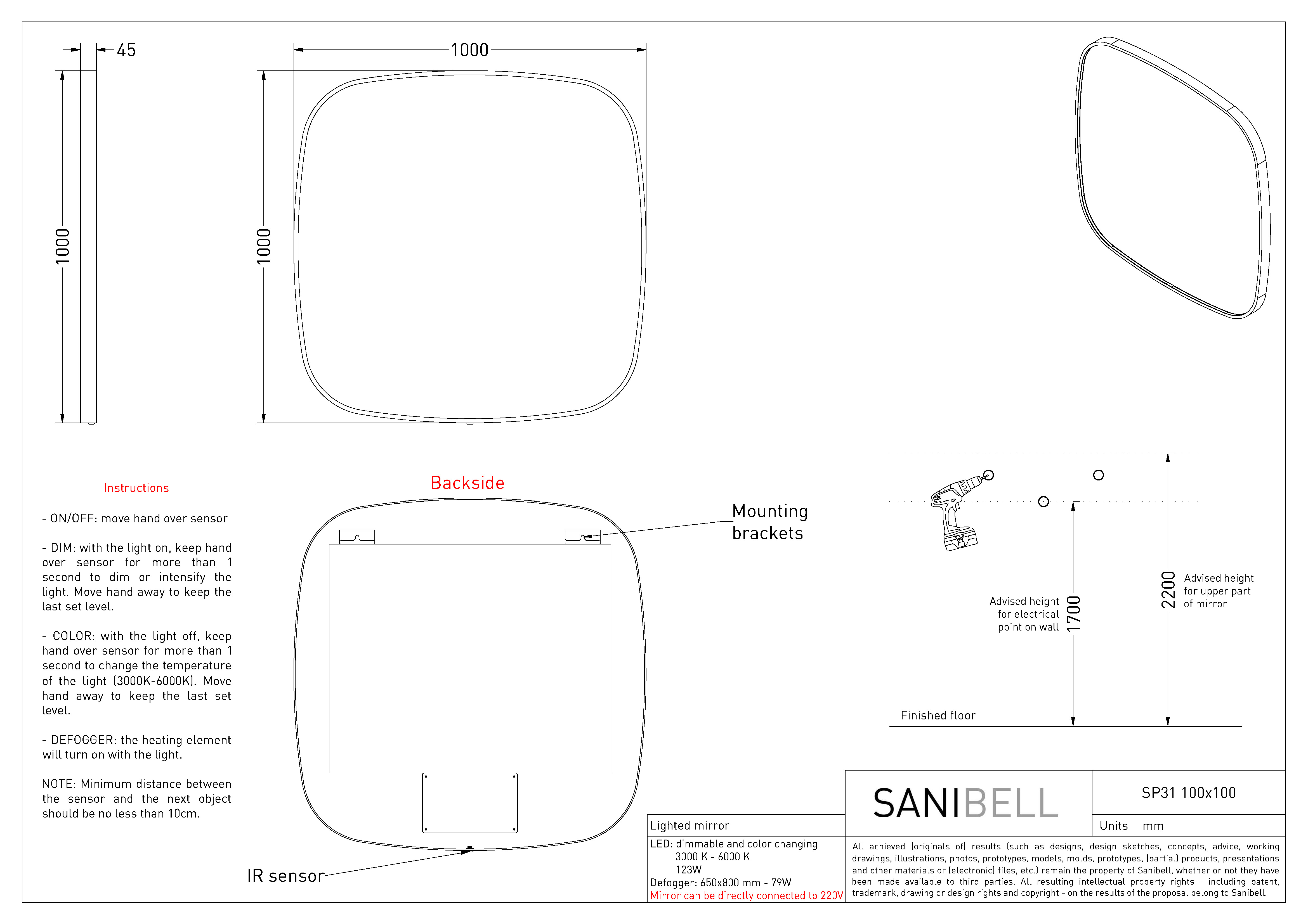 Sanibell Ink SP31 spejl m/lys, varme og sensor 100 x 100 cm - Gunmetal Superellipse-formet spejl fra Sanibell Ink med indbygget lys i rammen. Det eksklusive spejl har desuden indbygget memory funktion, så det husker forrige indstilling. Juster både lysets farve og styrke ved hjælp af den smarte touch-free sensorkontakt. Når du vælger dette spejl, kan du uden problemer bruge dit spejl, selv efter et langt, varmt bad, for spejlet har indbygget varme og er derfor dugfrit. Spejlet leveres i 6 flotte farver, så du kan fuldende indretningen på badeværelset med et spejl, der matcher både vandhane og badtilbehør. Specifikationer: