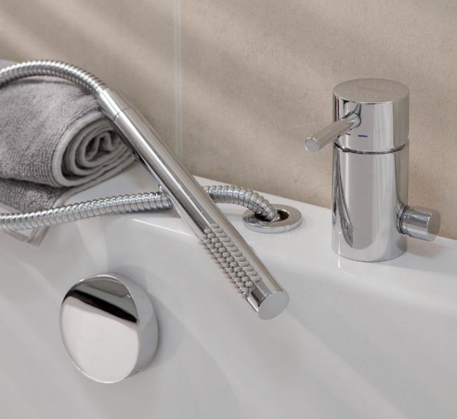 Strømberg Et-grebs armatur med håndbruser. Vandpåfyldning gennem overløb inkl af-overløbssæt |