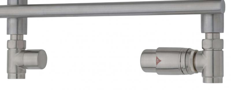 TVS Ventilsæt type 210 m/returtermostat, ligeløbende, Børstet stål Retur ventilsæt type 210 er et ligeløbendeventilsæt med retur termostat som bruges når man skal have sin håndklædetørrer monteret på central- / fjernvarmesystemet. Brugen af denne type ventil kræver at der kommer rør op fra gulvet eller ned fra loftet. Man vil typisk bruge denne type ventil hvis man ønsker en løsning hvor man jævnligt gerne vil stille på temperaturen. Denne type ventil anbefales til fjernvarme. Reguleringen er termostatstyret og dette gør den nem at indstille til den ønskede temperatur. Termostaten skal sidde på den side hvor returvandet kommer. Termostaten vil så sørge for at vandet i håndklædetørreren har en fast og ensartet temperatur. Specifikationer: