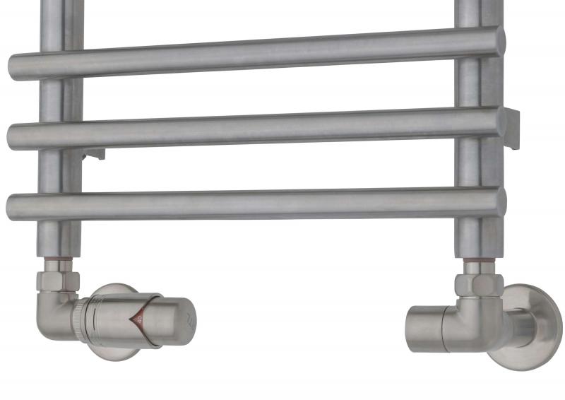 TVS Ventilsæt type 221 m/returtermostat, venstre, vinkelløbende - Børstet rustfrit stål Retur ventilsæt type 221 er vinkel ventilsæt med retur termostat som bruges når man skal have sin håndklædetørrer monteret på central- / fjernvarmesystemet. Brugen af denne type ventil kræver at der kommer rør ud fra væggen. Man vil typisk bruge denne type ventil hvis man ønsker en løsning hvor man jævnligt gerne vil stille på temperaturen. Denne type ventil anbefales til fjernvarme. Reguleringen er termostatstyret og dette gør den nem at indstille til den ønskede temperatur. Termostaten skal sidde på den side hvor returvandet kommer. Termostaten vil så sørge for at vandet i håndklædetørreren har en fast og ensartet temperatur. Type 120 og 220 er til de varmesystemer hvor returvandet kommer i højre siden og type 121 og 221 er til venstre side. Til disse ventilsæt medfølger rør afdækninger med rosetter i samme overflade Specifikationer: