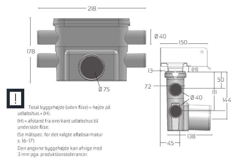 Unidrain Udløbshus 75mm Vandret m/Vandlås & Dobbelt Sideindløb Inkl optagelig vandlås med to muligheder- - Placer vandlåsen i toppen så den kun bruges af gulvafløbet - Skub vandlåsen ned i udløbshuset. så den også kan bruges til de to øverste sideindløb De to nederste indløb kræver seperat vandlås Kan vendes 180° ved behov for bagudrettet udløb 4 styk ø 40 mm sideindløb, åbnes efter behov |