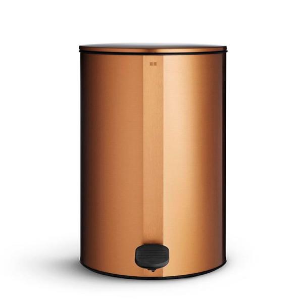 Unidrain Reframe toiletspand m/pedal - Børstet kobber (PVD) Med Unidrain Reframe toiletspanden kan du nyde en på samme tid smuk og praktisk toiletspand i minimalistisk design. Match farven med Unidrain Reframe badeværeksestilbehør for et gennemført udtryk på hele badeværelset. Toiletspanden har en funktionel, udtagelig spand, hvorpå der sidder et særligt, specialudviklet tape, som holder posen på plads og sørger for at den ikke falder ned. Når posen kommes i spanden, krænges den helt enkelt ud over kanten og klistres fast med tapen. Denne tape er udviklet til at kunne bruges igen og igen. Når du træder på toiletspandens pedal, vil du opleve at spanden er stabil og bliver hvor den skal. Det gør den også pga. den skridsikre gummiring, som sidder på bunden af spanden. Spanden er desuden udformet således at låget ikke rammer væggen, når det åbner og lukker - selvom spanden står helt op til væggen. Unidrain Reframe toiletspanden har altså flere, klare fordele og er udformet for at give den bedst mulige oplevelse, når du bruger den. Specifikationer: