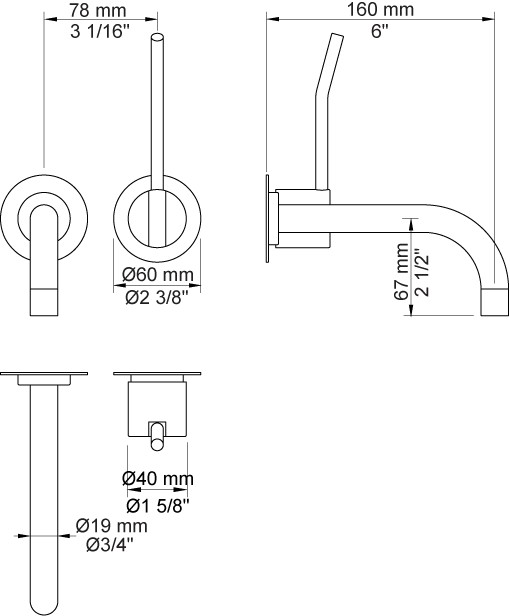 Vola Et-grebsblander med keramisk ventilenhed og fast afgangsmuffe Fast udløb, 160 mm, ø19 mm Langt 100 mm Rosetter Krom 16 ½''RG/PEX |