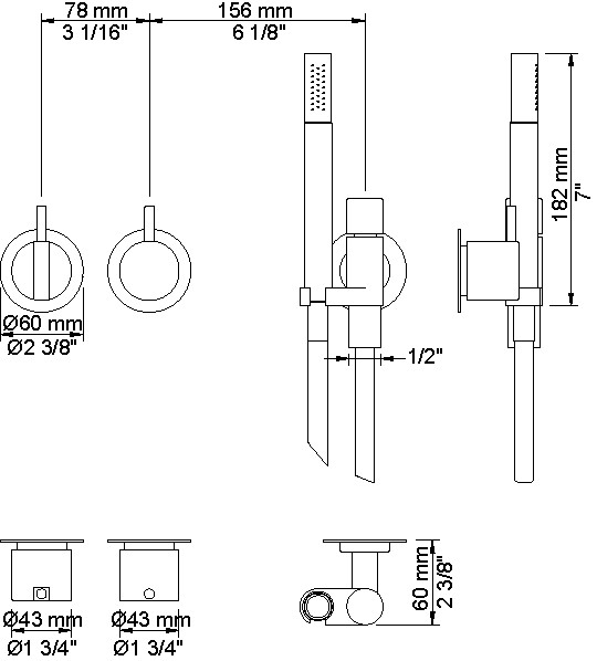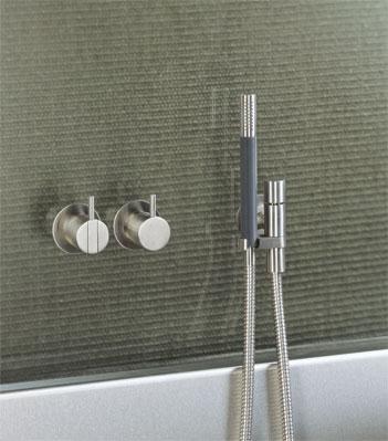 Vola Et-grebsblander for stor vandmængde med keramisk ventilenhed og omskifter. T2 Håndbruser med metalslange og holder Separat udløb Rosetter Krom 16 ½''RG/PEX