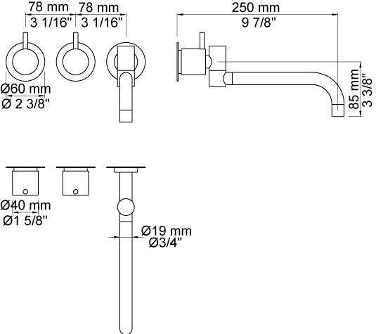 To-grebsblander med keramiske ventiler 600, 2 greb NR17, 250 mm dobbelt svingbar tud 0303 stk. 60 mm rosetter 001. Kan også anvendes som køkkenarmatur. |
