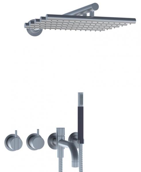 Vola Et-grebsblander for stor vandmængde med keramisk ventilenhed og omskifter samt løs afgangsmuffer. Kartud med omskifter og håndbruser, 200 mm, ø24 mm Vægmonteret hovedbruser Rosetter , lavt monteret Krom 16 ½''RG/PEX |