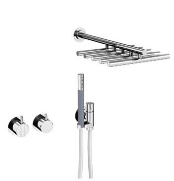 Vola Et-grebsblander for stor vandmængde med keramisk ventilenhed og omskifter samt løs afgangsmuffer. T2 Håndbruser med metalslange og holder Vægmonteret hovedbruser Dækplade Krom 16 ½''RG/PEX Billedet er uden dækplade |