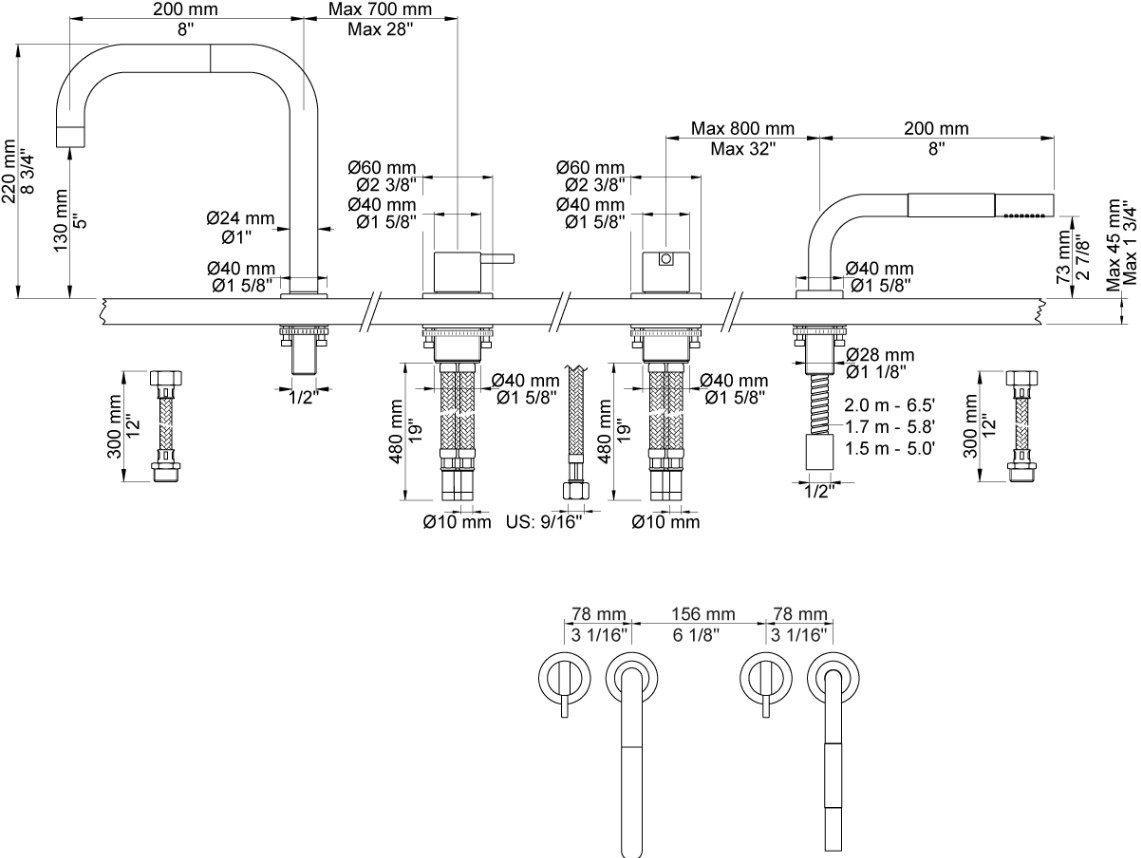 Vola Et-grebsblander SC10 med 360° dobbelt svingbar tud og et-grebsblander med håndbruser Dobbelt svingbar udløb, 200 mm, ø24 mm Krom 16 SPX |