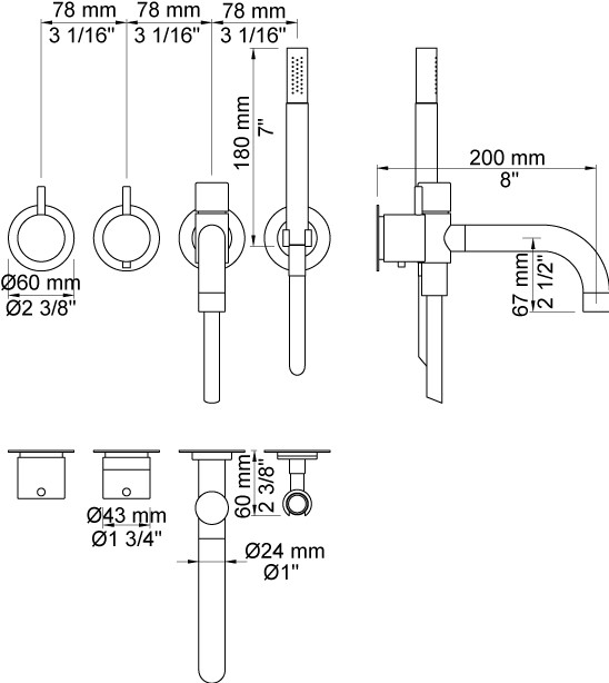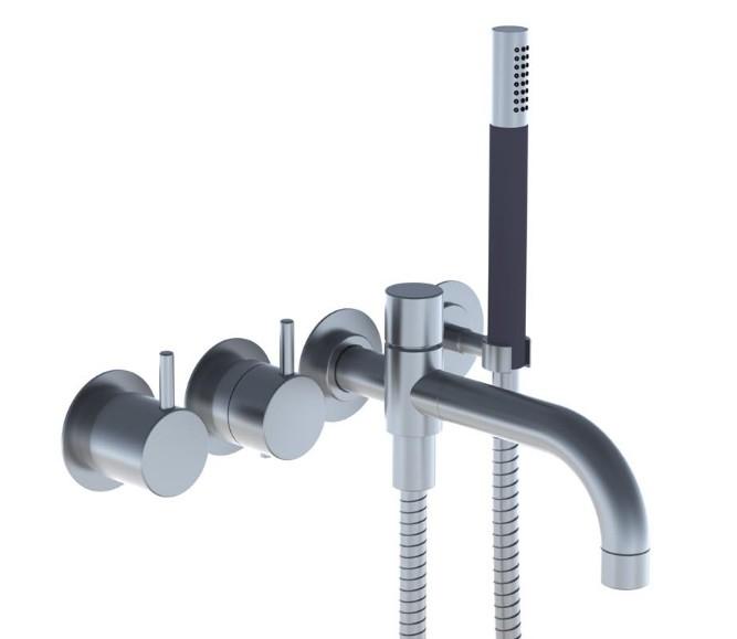 Vola Indbygningstermostat med fast afgangsmuffe Kartud med omskifter og håndbruser, 200 mm, ø24 mm Rosetter Krom 16 3/4''RG/PEX