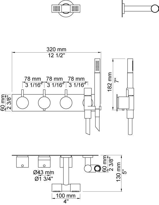 Vola Indbygningstermostat ¾'' med omskifter T2 håndbruser med metalslange og holder til højre Dobbelt hovedbruser, 115 mm Separat udløb Dækplade Krom 16 3/4''RG/PEX |
