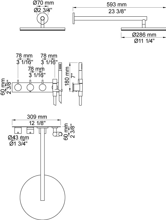 Vola 5474R-061 komplet brusesystem m/omskifter og bagplade - Krom Vola Indbygningstermostat ¾'' med omskifter T2 håndbruser med metalslange og holder til højre Hovedbruser, rund, vægmonteret Separat udløb Dækplade Krom 16 3/4''RG/PEX |