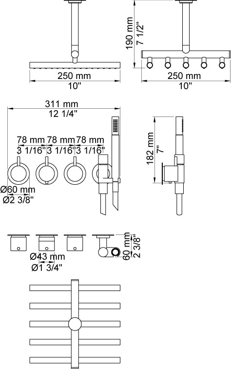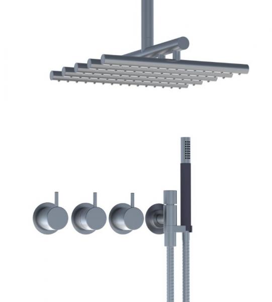 Vola Indbygningstermostat ¾'' med omskifter T2 håndbruser med metalslange og holder til højre Loftmonteret hovedbruser Separat udløb Rosetter Krom 16 3/4''RG/PEX |