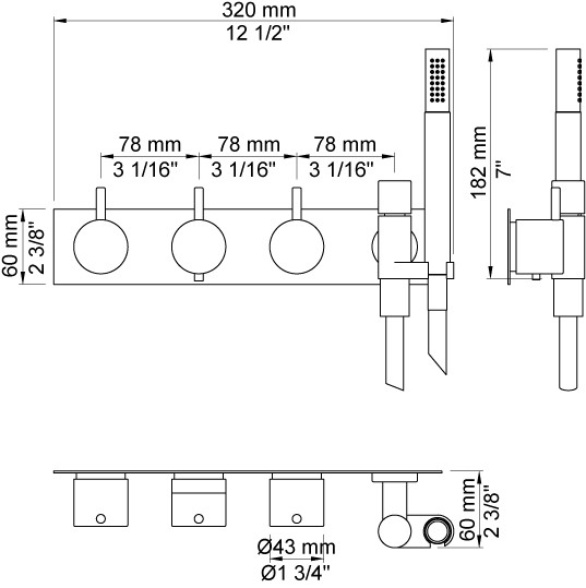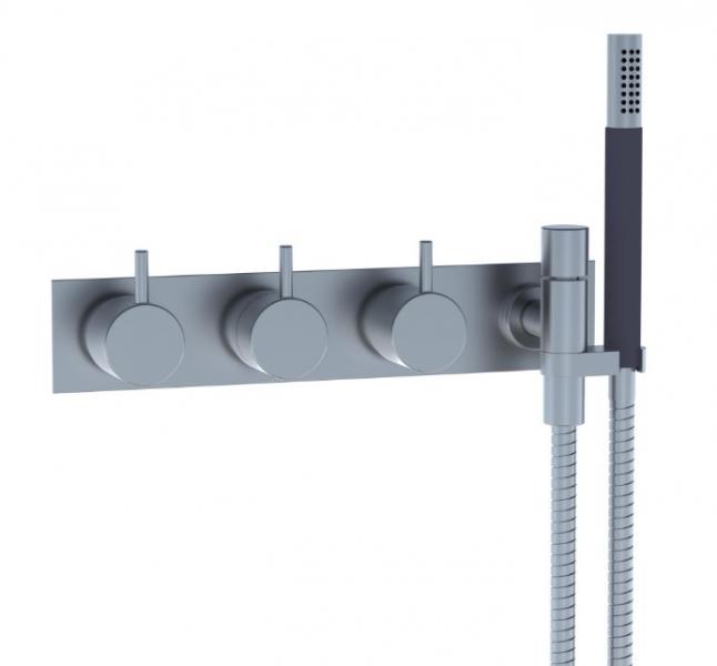 Vola Indbygningstermostat ¾'' med omskifter T2 håndbruser med metalslange og holder til højre Separat udløb Separat udløb Dækplade Krom 16 3/4''RG/PEX |
