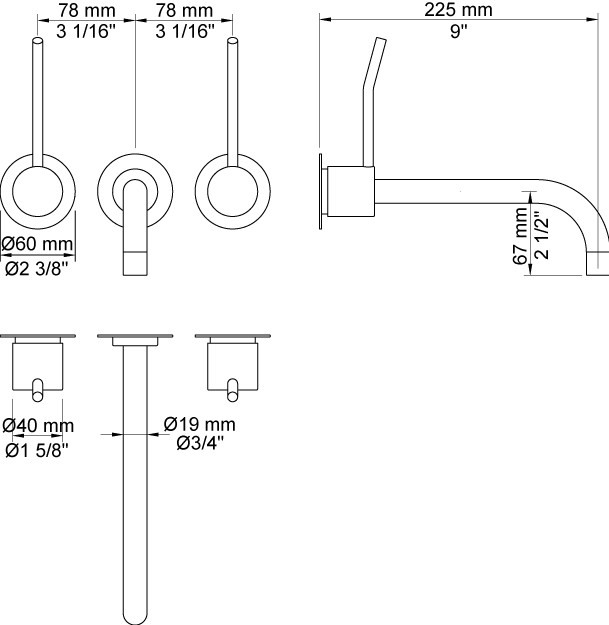 Vola To-grebsblander med afgangsmuffe i midten Fast udløb, 225 mm, ø19 mm Langt 100 mm Rosetter Krom 16 ½''RG/PEX |
