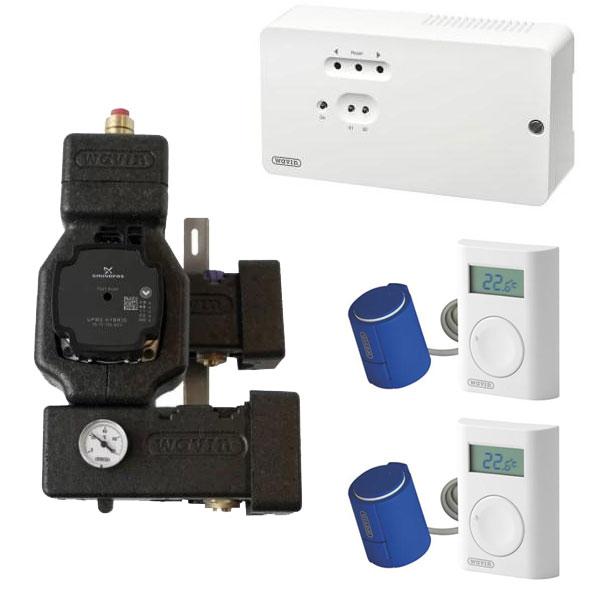 Wavin minishunt 2-rum AHC 9000 trådløs styring Komplet shunt til 2 rum med to styk rumtermostater. OBS: Varen er på lager - både til afhentning og dag-til-dag levering. Denne pakke bruges, hvis du har 2 rum/kredse, som du ønsker at styre med hver deres rumtermostat. Der medfølger 20 mm koblingssæt. Skal du bruge 16 mm rør eller anden størrelse, skal der tilkøbes koblingssæt - Se relaterede produkter. Pakken indeholder: