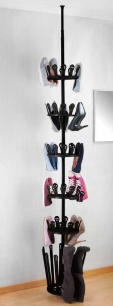 Wenko Achilles teleskopsystem til sko - Sort Wenko Achilles skostativ er en teleskopstang, der opbevarer og organiserer dine sko i højden i stedet for i bredden. Stativet bringer orden i kaosset, og det sparer gulvplads. Stativet består af en sort metalstang, hvorpå 6 ringe af plastik er placeret. På de 6 ringe kan der opbevares 30 par sko og 6 par støvler. Ringene kan drejes, så der nemt er adgang til alle sko. Skostativet er let at samle uden værktøj, og det monteres uden boring. Den højdejusterbare teleskopstang spændes fast mellem gulv og loft, og den kan forlænges op til 3 meter.